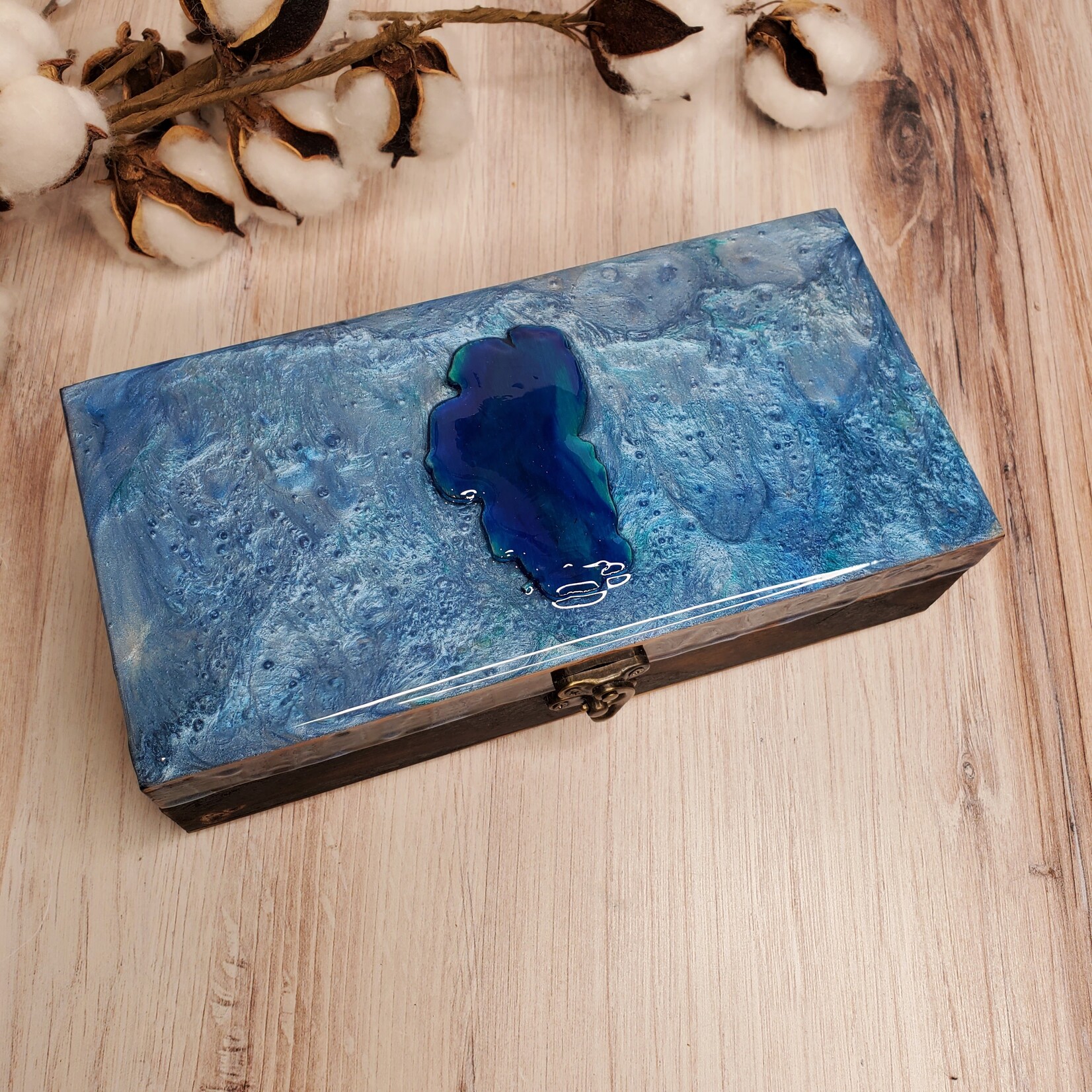 Epoxy, acrylic paint, and wood box featuring a bear or a Lake Tahoe cutout on the lid of the box. Each box is unique and one-of-a-kind and can never be created exactly the same way a second time. Includes a brass latch and hinges on the lid.